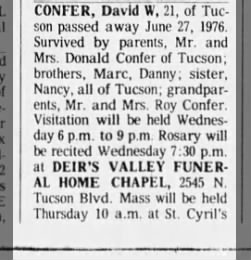 CONFER, David W, 21, of Tucson passed away June 27, 1976. Survived by
