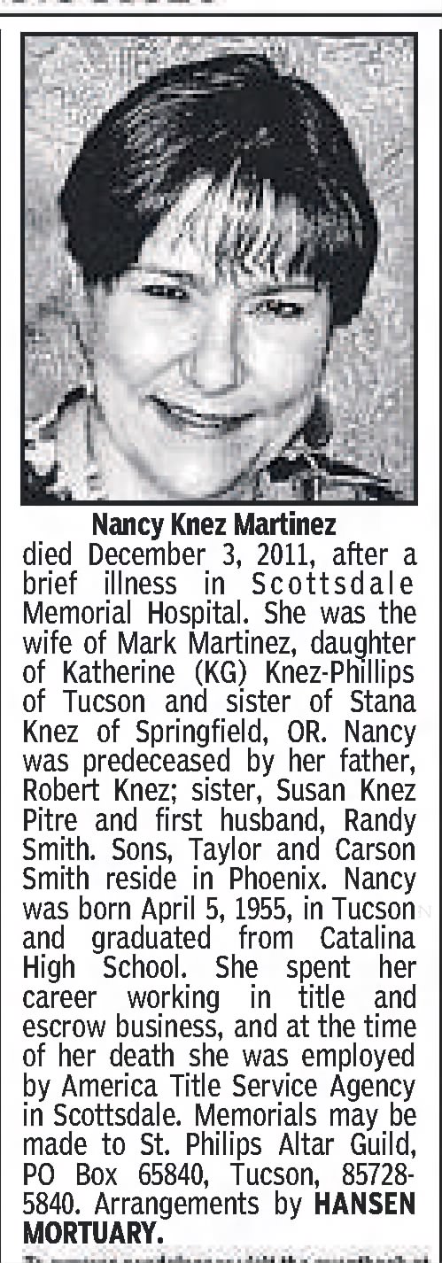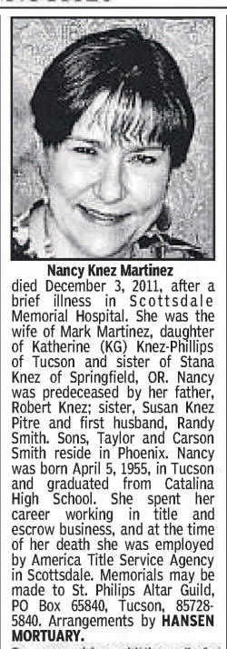 1955 - 2011She was the wife of Mark Martinez, daughter of Katherine (KG) Knez-Phillips of Tucson and sister of Stana Knez of Springfield, OR. Nancy was predeceased by her father, Robert Knez; sister, Susan Knez Pitre and first husband, Randy Smith. Sons, Taylor and Carson Smith reside in Phoenix.