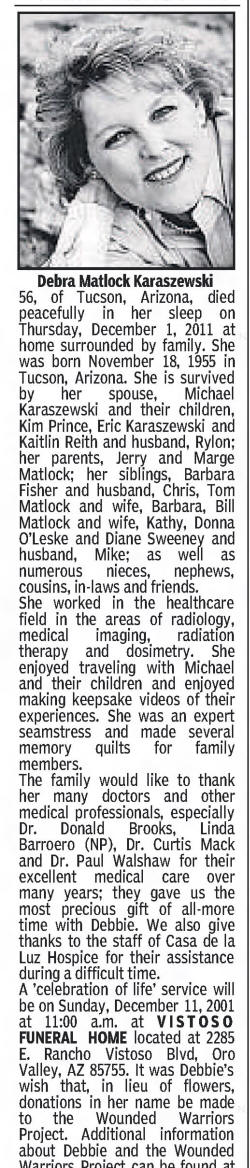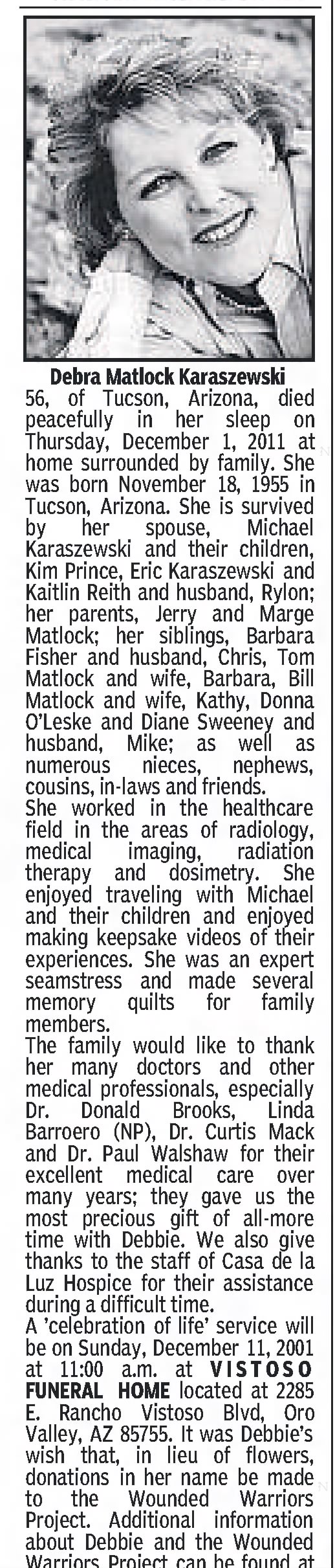 Debra Matlock Karaszewski 56, of Tucson, Arizona, died peacefully in her sleep on Thursday, December 1, 2011 at home surrounded by family.